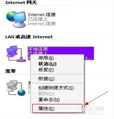 步骤二:在弹出的窗口鼠标右键选择“本地连接”,对话框选择“属性”,弹出属性窗口: