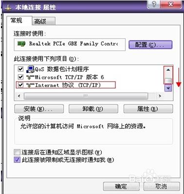 步骤三:在属性窗口的“此链接使用下列项目”多选框下拉列表至底部,到“Internet 协议(TCP/IP)”选项上左键双击,弹出属性对话框: