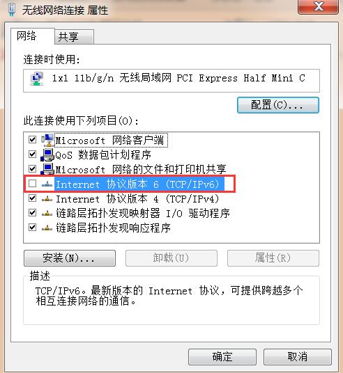 步骤五:在:“此连接使用下列项目”中把“internet协议(TCP/IPV6)”前面的“对号”去掉