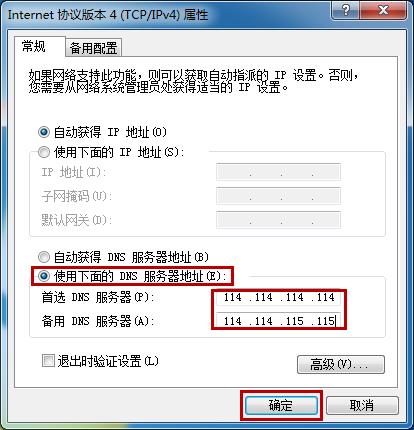 步骤六:在‘Internet 协议(TCP/IP)’属性框中勾选‘使用下面的DNS服务器地址’,并填写首选DNS服务器地址为:114.114.114.114,修改完成后点击确定。